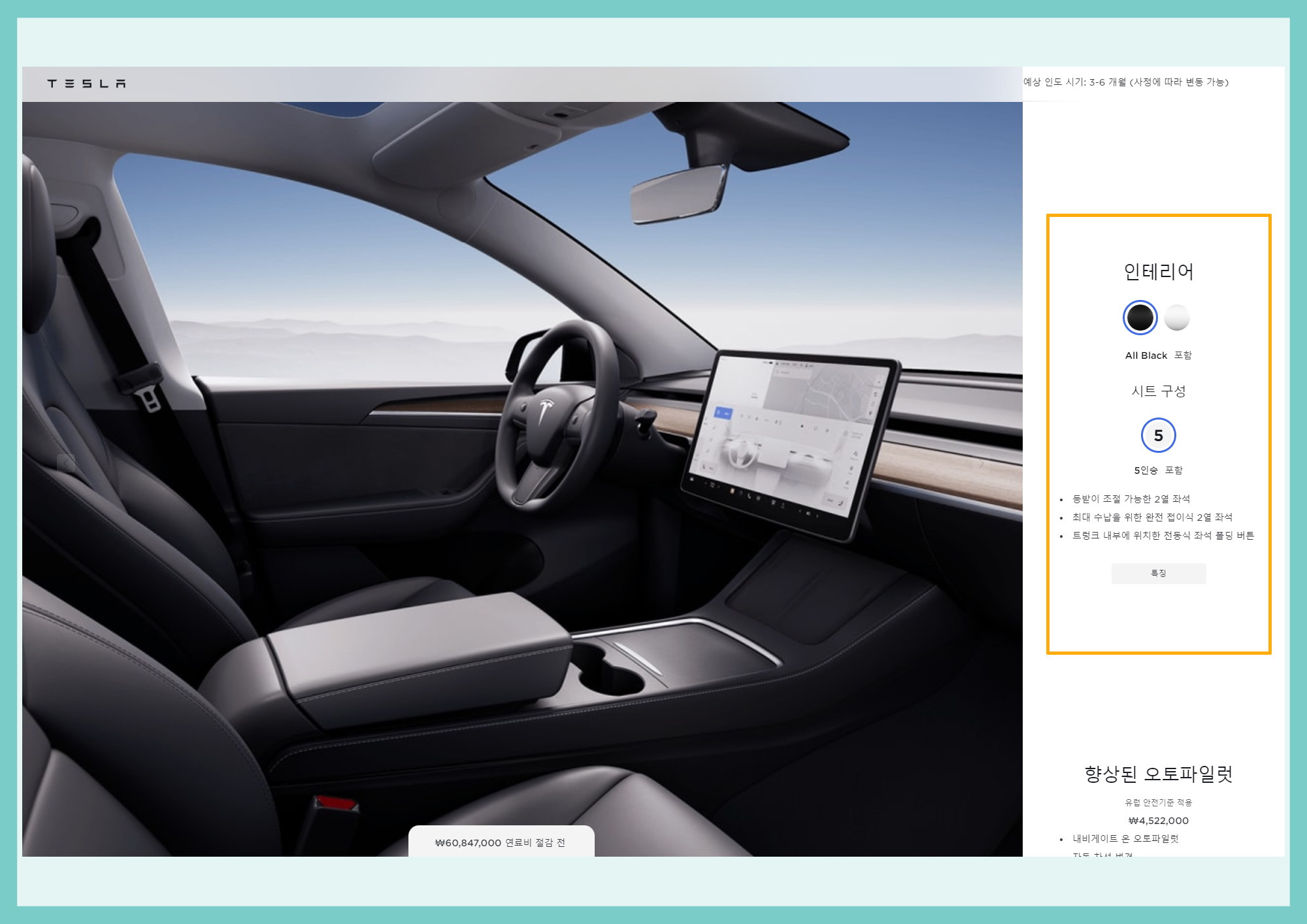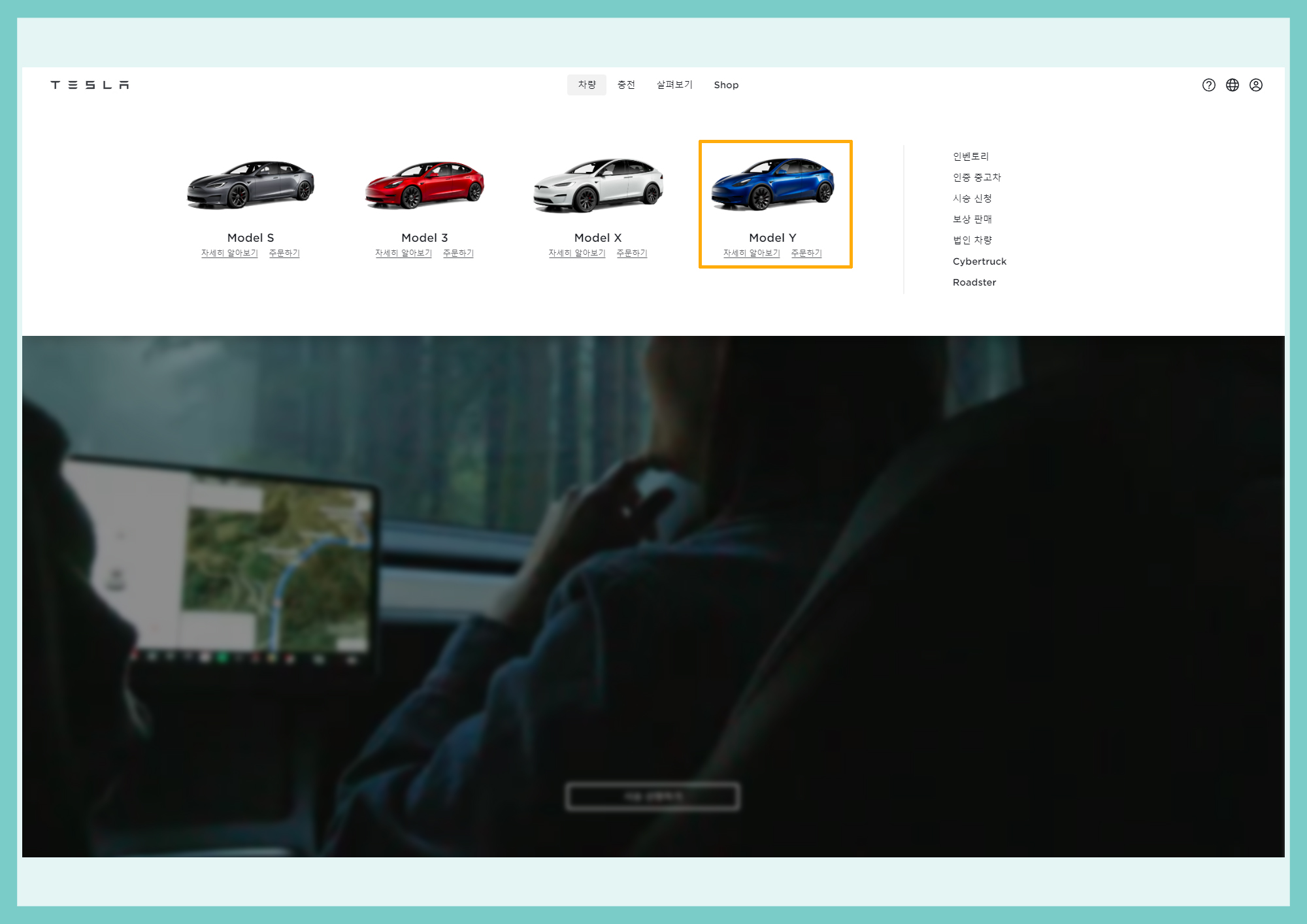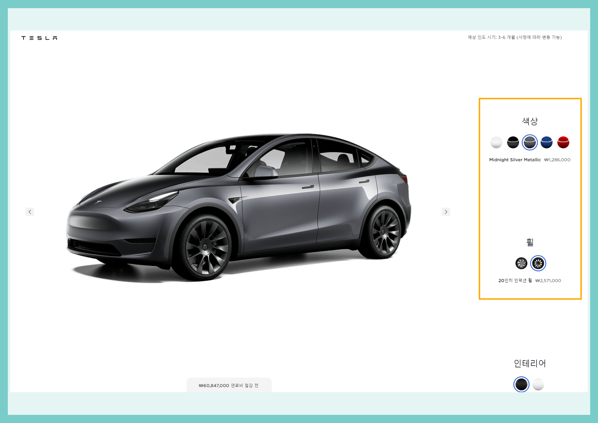 상단 차량 텝에서 구입하려는 모델 텝을 선택해 주면 된다. 나는 모델 Y를 선택